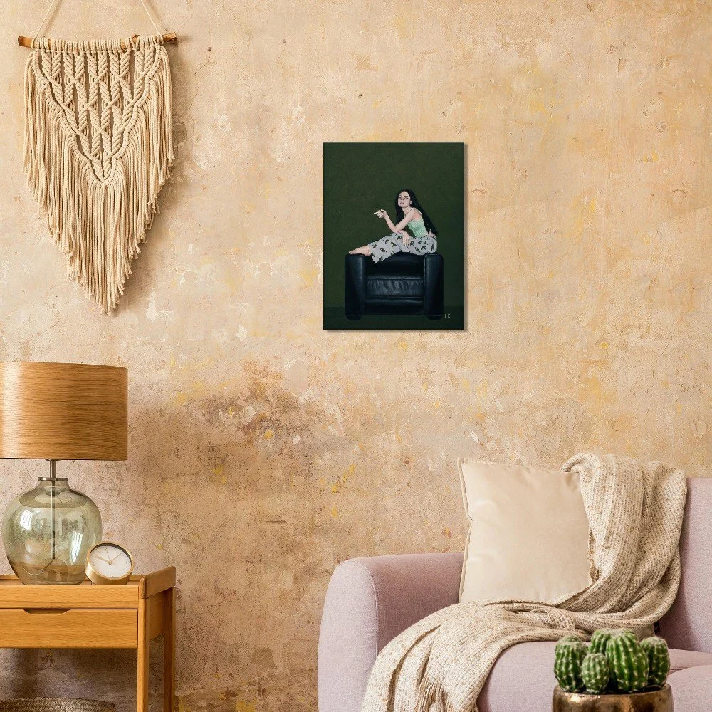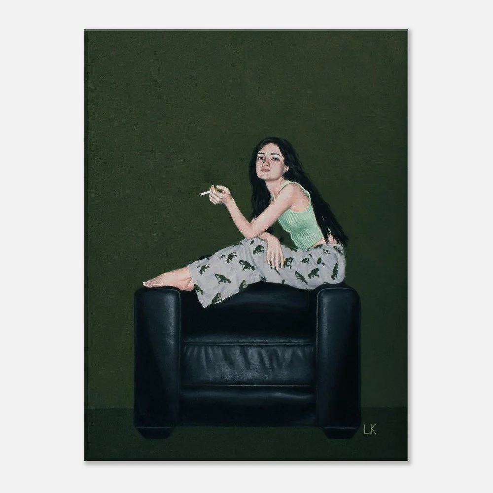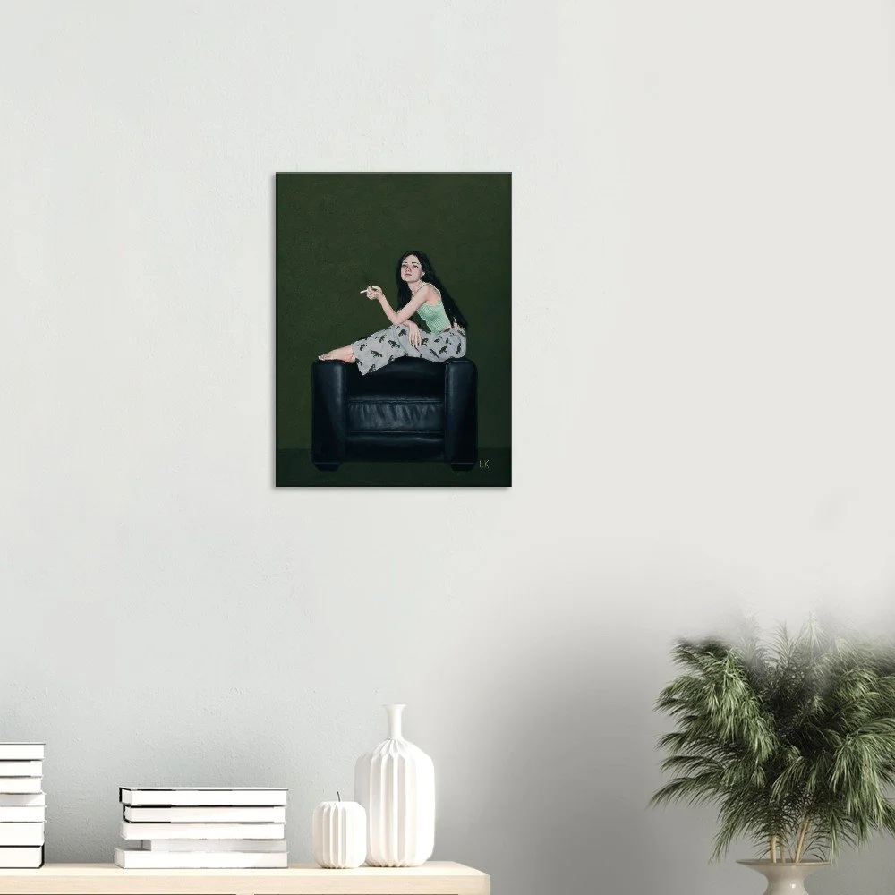 The Muses are a series of portraits that I have painted of my housemates in Tucson, Az. The Muses 2 features one of my best friends Erin sitting casually on the armrests of a black leather chair looking out with a cigarette in her hand.