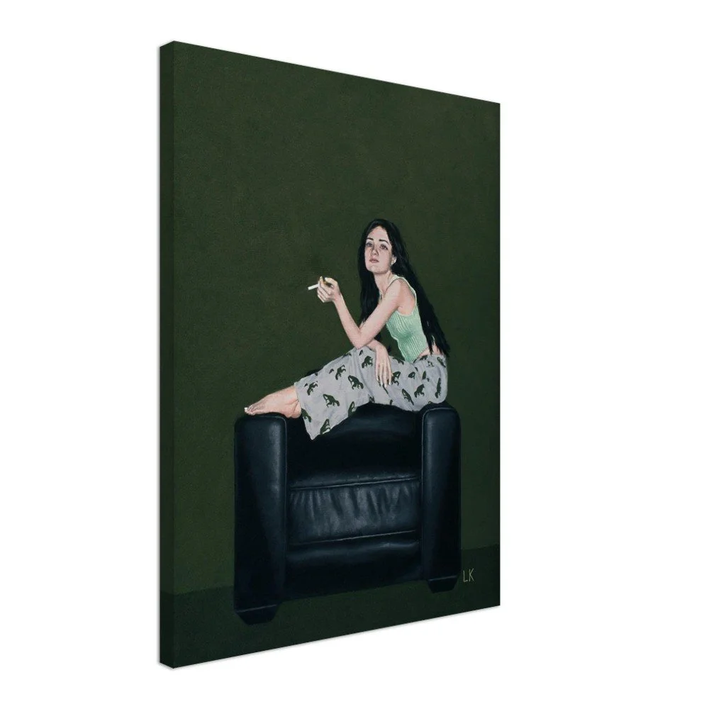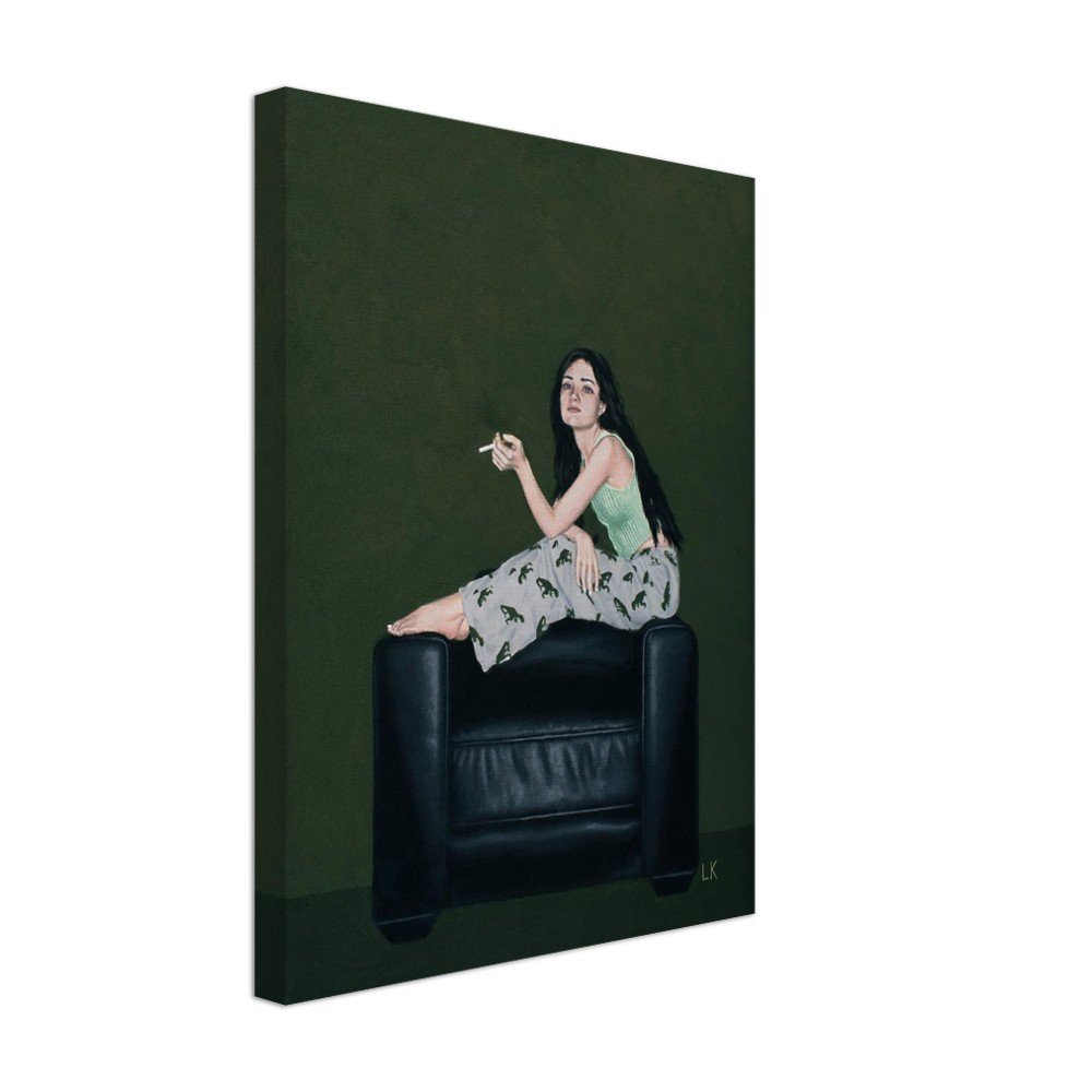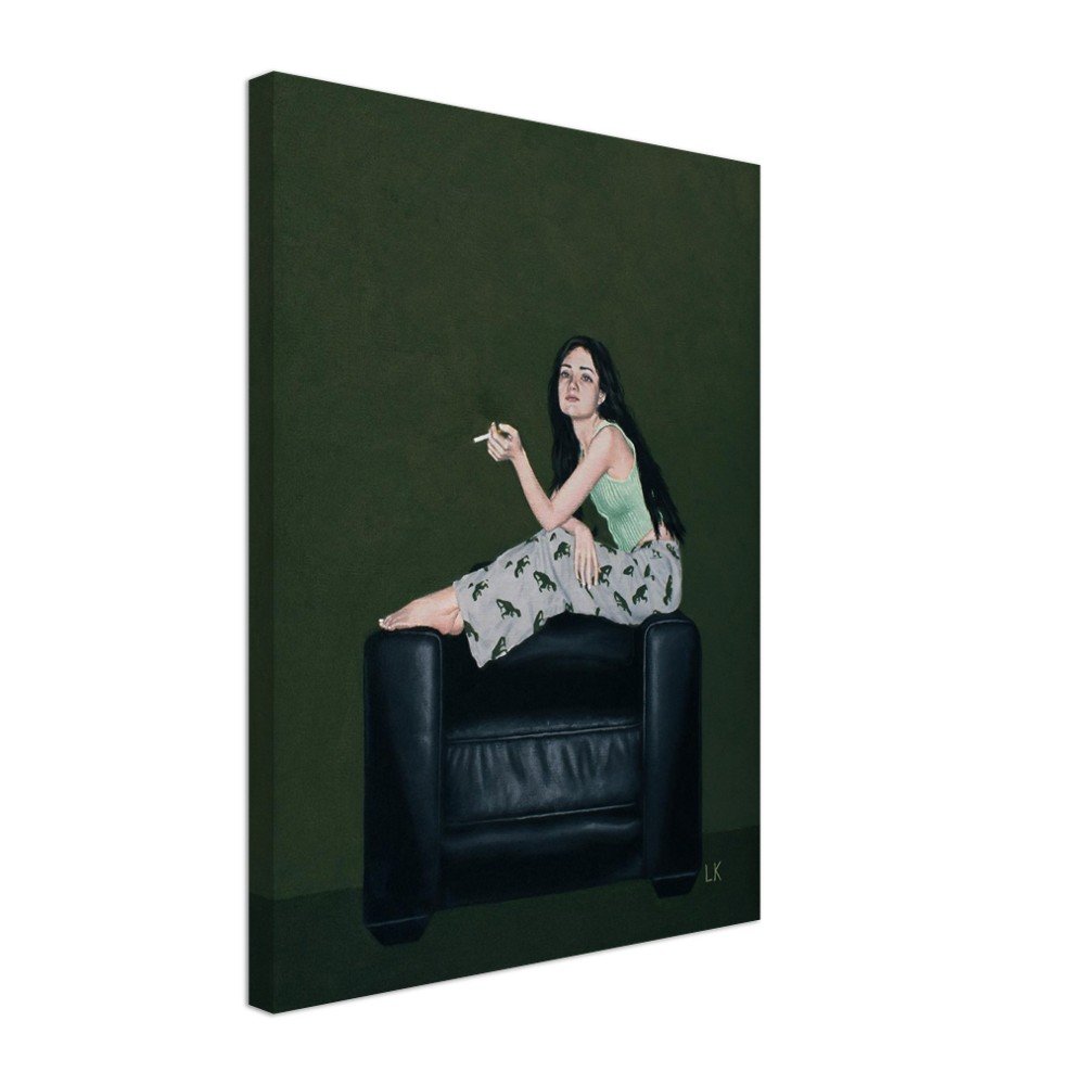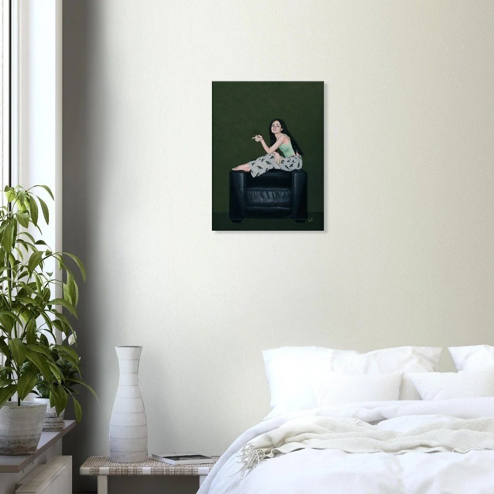 The Muses are a series of portraits that I have painted of my housemates in Tucson, Az. The Muses 2 features one of my best friends Erin sitting casually on the armrests of a black leather chair looking out with a cigarette in her hand.