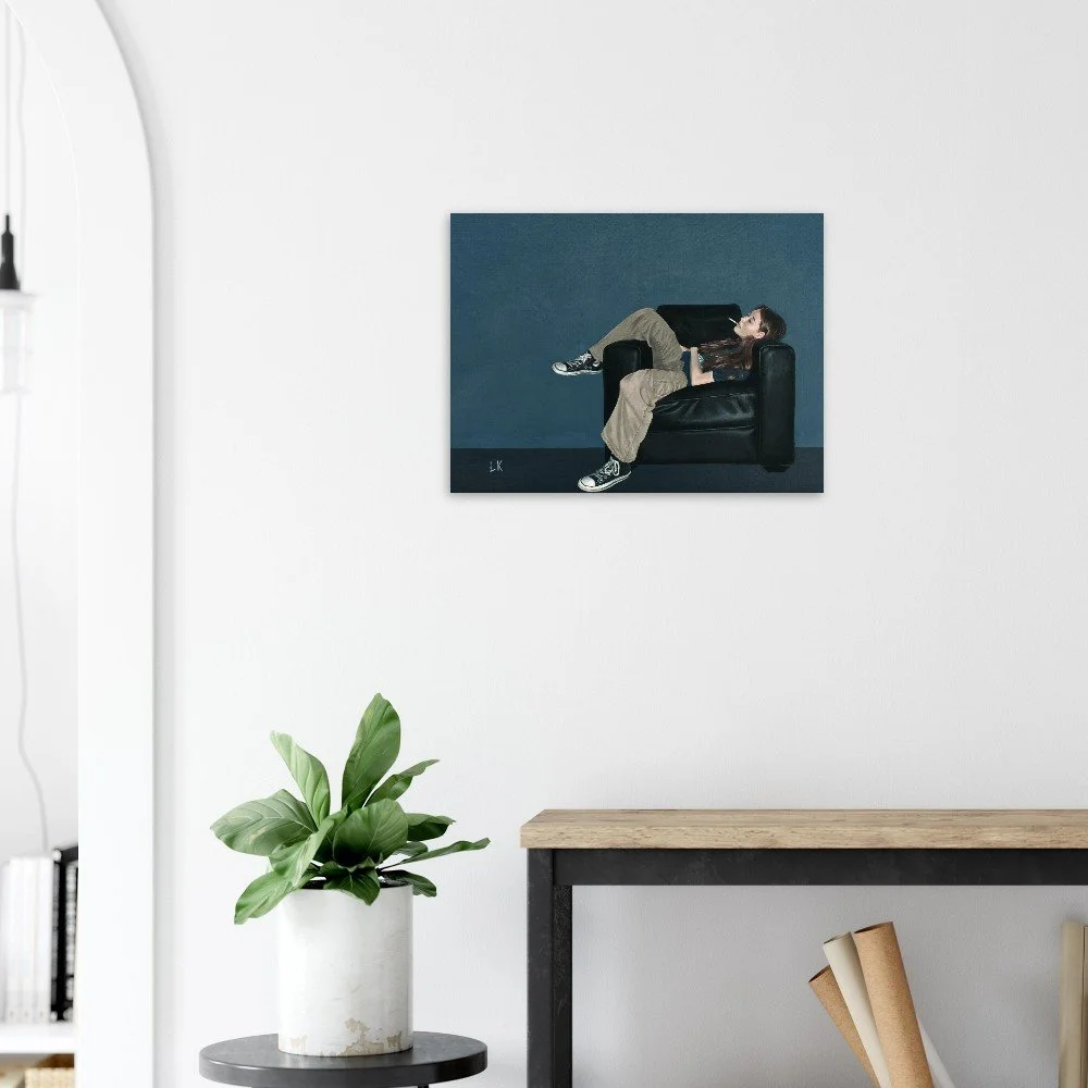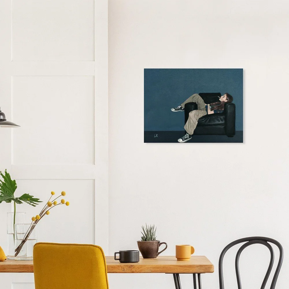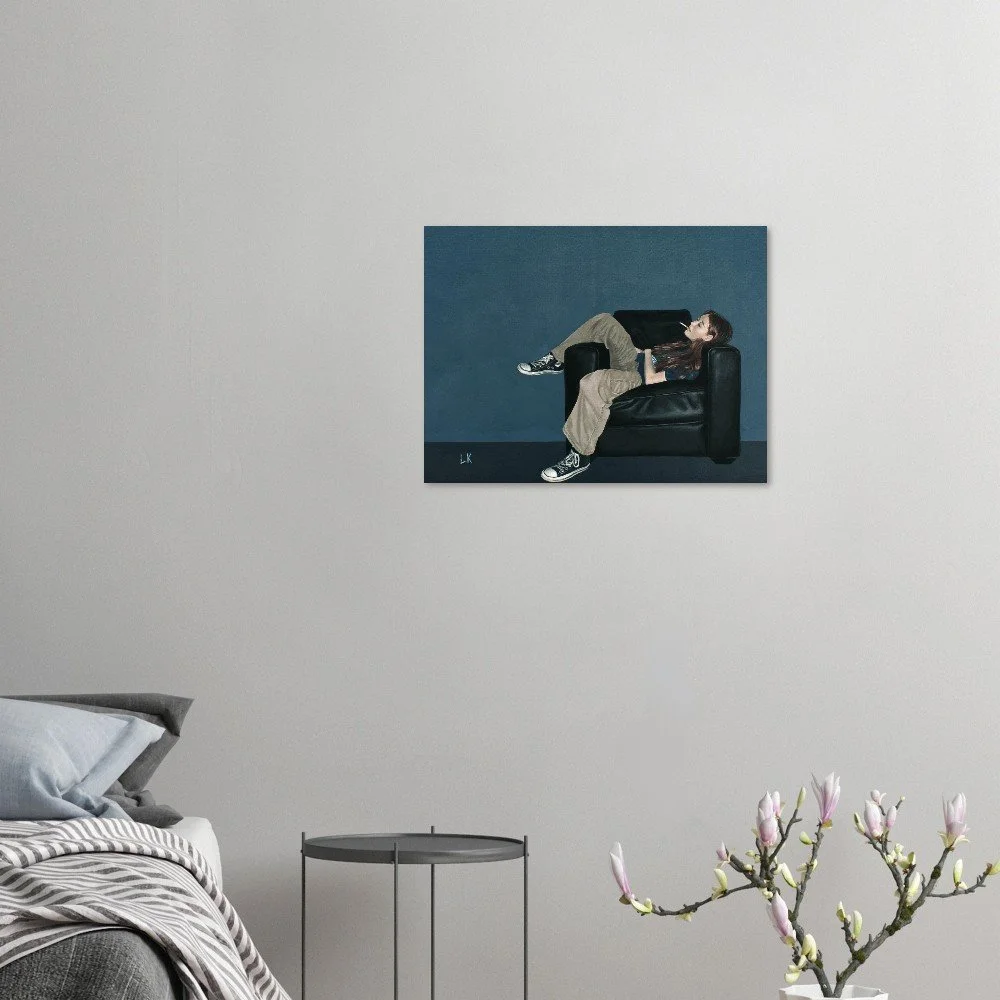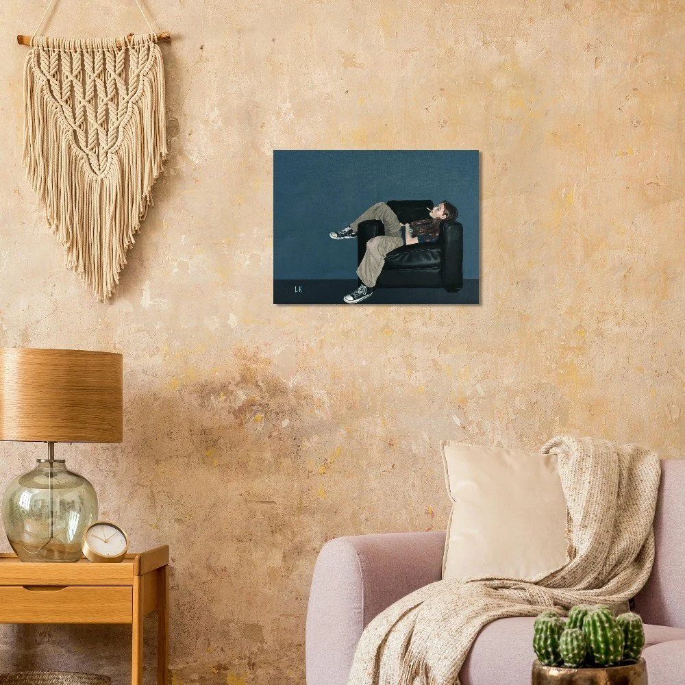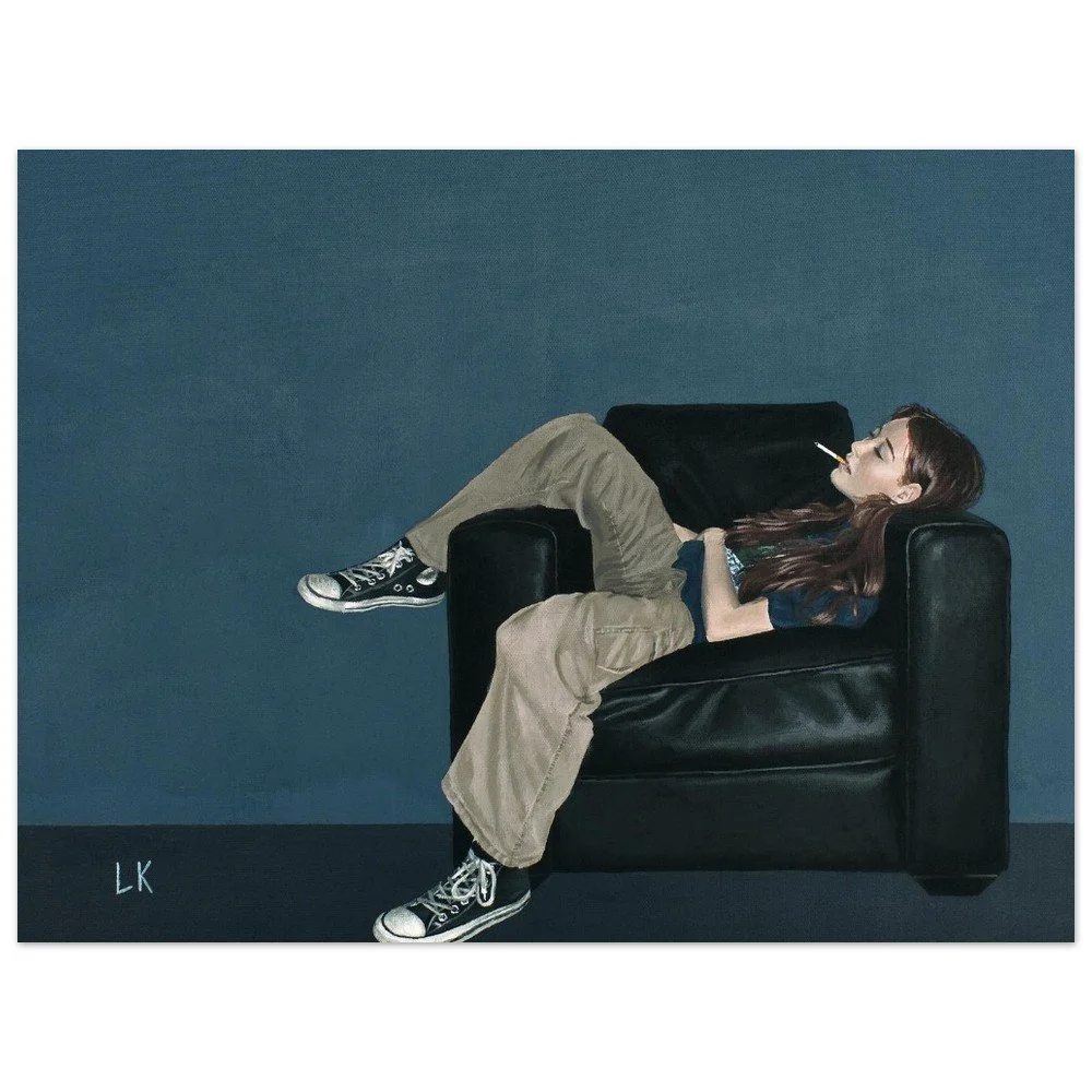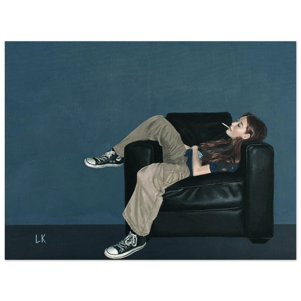 The Muses are a series of portraits that I have painted of my housemates in Tucson, Az. The Muses 3 features one of my best friends Sophie lounging in a black leather chair with a cigarette in her mouth.